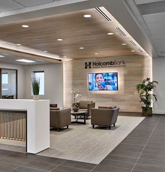 Demolition of the Byron Burger King to make way for the new Holcomb Bank. A new wood framed structure capsuled with a metal roof, EFS, and brick. Interior architectural finishes included a vaulted ceiling conference room, large Italian plank tile, Neolith stone teller line and check desk, wood plank accent wall and ceiling in the lobby, and the latest banking equipment.